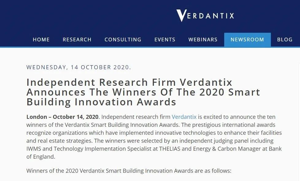 ▲ Verdantix公布的“2020智能建筑创新奖”获奖名单