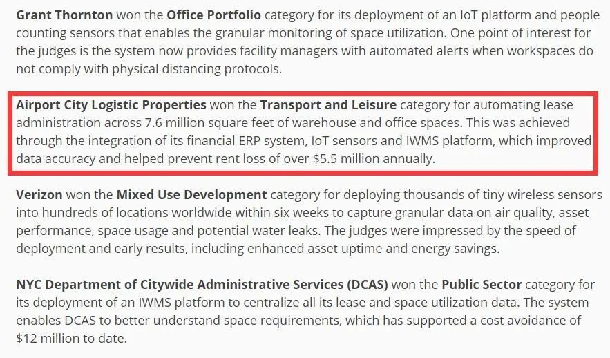 “ACL-ARCHIBUS智慧园区资产管理系统”项目顺利获得有效整合集成式工作场所管理系统(IWMS)、物联网( IoT)传感器和财务ERP系统,提高了数据的准确性、稳定性和处理效率,在超过70万平米的物流设施和办公空间实现了高度信息化的租赁管理,将BIM+FM的最新前沿技术应用于资产管理系统,成功实现航空物流园仓储空间、设备设施和资产全生命周期的数字可视化管理。
