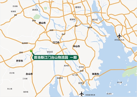 项目位于江门市台山工业新城园区内,周边交通区位优越——深茂铁路、中开高速(深中通道)、新台高速、国道240和台开快速路等重大交通设施纵横,深茂铁路台山站设在园区核心位置,公益港码头(2500吨级,4个泊位)位于园区北部;可以快速进入珠三角地区,被公认为是区域配送中心和存储中心的绝佳选择。
